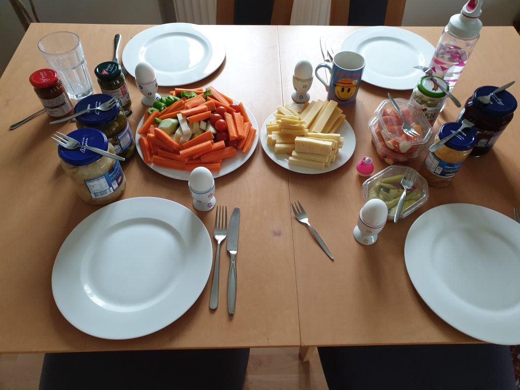 Heute hat es ganz schön geregnet beim Laufen, aber wenigstens war es warm. Mein Knöchel hat auch keine Probleme mehr bereitet. Essenstechnisch war es heute nicht so prall. Zum Frühstück hatte ich 2 Butterbrezeln, dazu etwas Obst von daheim. Mittags gabs Cordon Bleu mit Pommes *hust*, ja ich weiß, gesund ist was anderes. Aber wichtig ist doch, dass man es als Ausrutscher akzeptiert und dann einfach wieder weiter macht. Der Arbeitstag war recht lang heute, aber es gab zum Abendessen ausnahmsweise mal Brotzeit, jedoch ohne Brot. Nur Rohkost, Käse, Pickles und Antipasti.