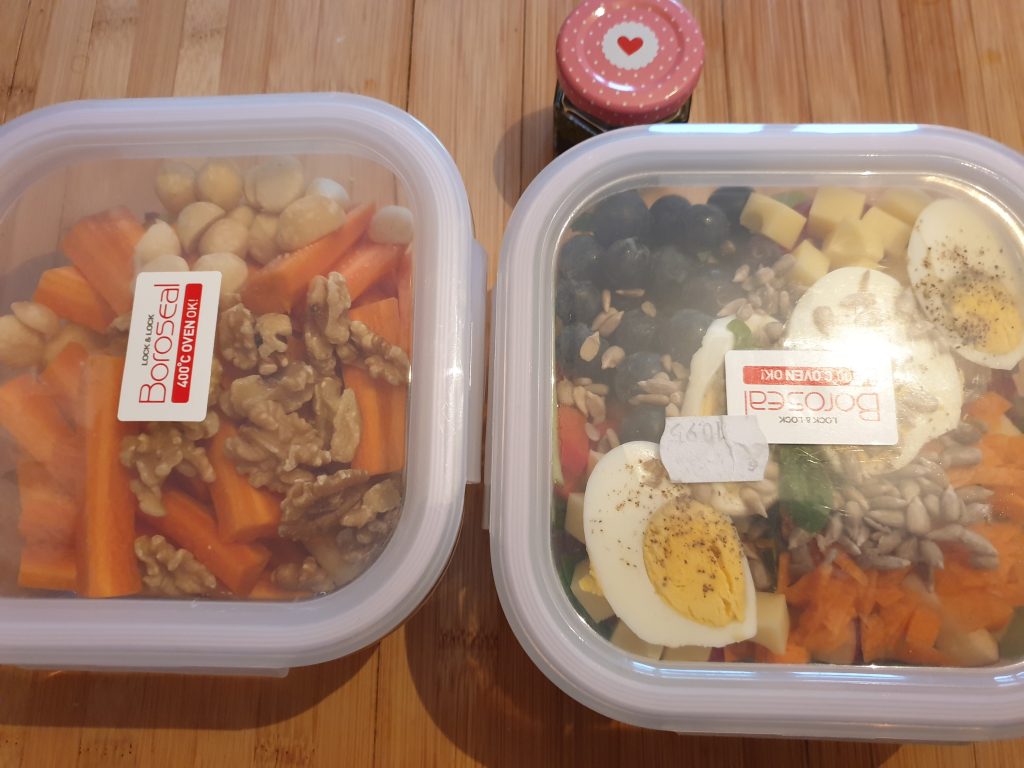 Nach dem Abendessen habe ich wieder für morgen zum Frühstück Karotten, Äpfel und ein paar Nüsse vorbereitet und für Mittag für meinen Mann und mich je einen Salat mit separatem Dressing. Dazu hatte ich mir extra kleine Gläschen besorgt. Die Salate zum Lunch peppe ich gerne mit Samen, Eiern, Nüssen oder Obstigen, meistens Beeren, auf. Auch das Auge will befriedigt sein. Außerdem bilde ich mir ein, dass, je mehr Geschmacksnerven ich anspreche, ich länger „befriedigt“ bleibe und nicht so schnell Lust auf Ungesundes bekomme.
